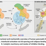 A defining feature of pancreatic lipase is interfacial activation, the dramatic increase in catalytic activity observed when the enzyme encounters a lipid–water interface. In aqueous solution, the active site is shielded by a mobile lid domain, which adopts a closed conformation. Upon interaction with lipid droplets, conformational rearrangements shift the lid into an open state, exposing the catalytic machinery and forming a hydrophobic plateau optimized for substrate binding.7