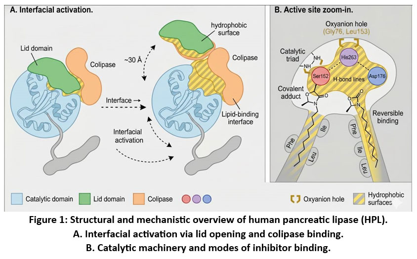 ABSTRACT:The main dietary triglyceride hydrolyzing catalyst, and a long time pharmacological parameter of decreased dietary caloric intake, is pancreatic lipase (PL). Recent progress in structural biology, high resolution crystalography and computational models has given a new understanding of the catalytic triad of PL and interfacial activation, lid dynamics and stabilization of colipase dependent. These mechanistic underpinnings have facilitated more rational search of the varied classes of inhibitors including covalent β-lactones to reversible natural products (flavonoids, aurones, chalcones) and contemporary synthetic scaffolds like thiazolidinedione, triazole, and multi-target hybrid chemotypes. The mechanism by which the inhibitors interact with the hydrophobic acyl-binding tunnel, oxyanion hole, and aromatic platform around Ser152 is now understood using quantitative structure-activity correlations, molecular docking, molecular dynamics simulations, and pharmacophore models. The new approaches to medicinal chemistry, such as allosteric inhibition of lid movement, partial inhibition to enhance the safety, the investigation of non-2-lactone electrophiles, and AI-assisted scaffold discovery provide avenues to effective, yet safer inhibitors. The enzymatic mechanism, structural biology, SAR trends, and computational methods have been incorporated in this review to present a single framework in designing next-generation pancreatic lipase inhibitors.