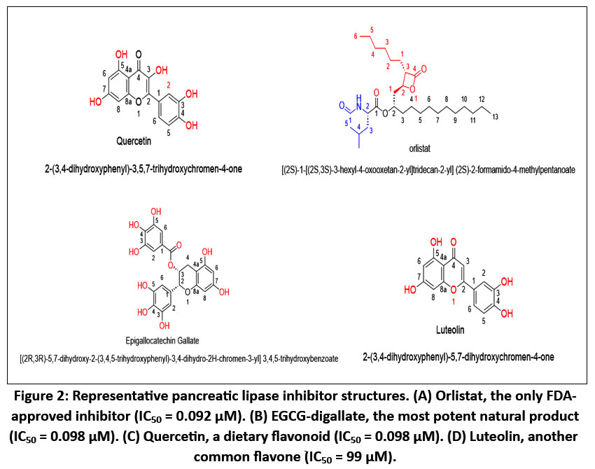 Pancreatic lipase inhibition has been explored across multiple chemical spaces, reflecting the enzyme’s complex interplay of hydrophobic substrate binding, interfacial activation, and unique catalytic architecture.8